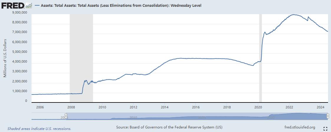 美国ZF的隐性债务,美国以外的人可能知道的很少,国内就没有看见有人讲这件事。但这件事在美国国内知道的人可能不少,如此发展下去,将来美国国债只有靠美联储接盘,长期通胀不可避免,因此各州都在另谋出路。美联储的资产总额在2007年底只有8900亿,2022年四月膨胀到8.9万亿,当前为7.2万亿。