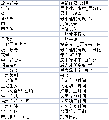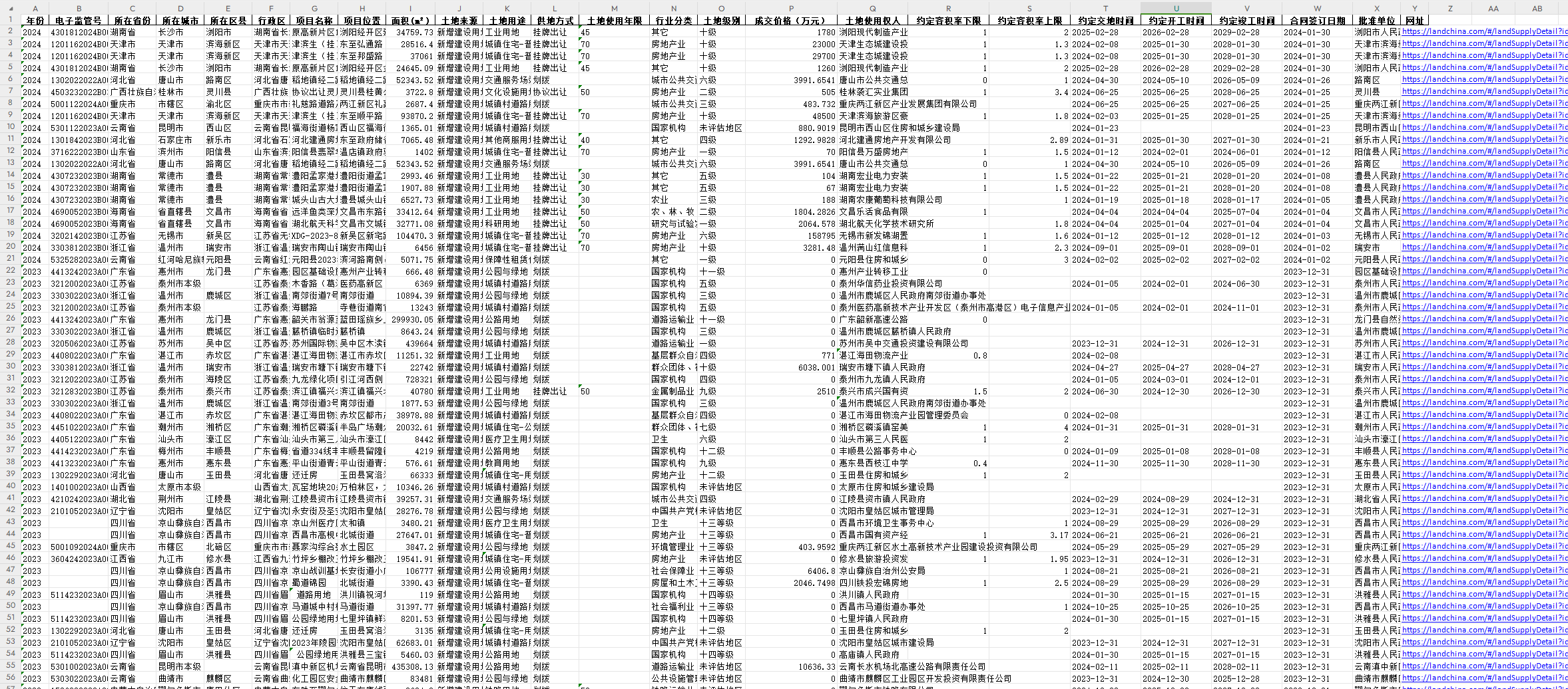 2.数据范围:(23年指标)年份 电子监管号 所在省份 所在城市 所在区县 经度 纬度 项目名称 项目位置 面积(m2)土地来源 土地用途 供地方式 土地使用年限 行业分类 土地级别 成交价格(万元) 土地使用权人 约定容积率下限 约定容积率上限 约定交地时间 约定开工时间 约定竣工时间 合同签订日期 批准单位 网址