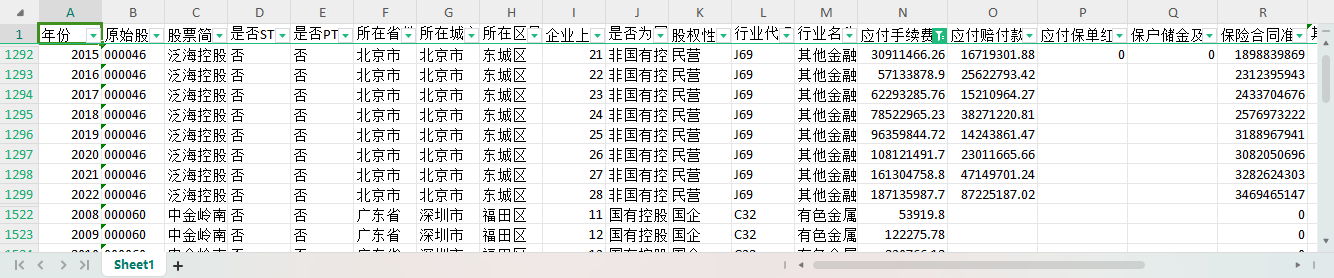 年份 原始股票代码 股票简称 是否ST 是否PT 所在省份-注册地详细 所在城市-注册地详细 所在区县-注册地详细 企业上市年龄 是否为国有控股-依据实际控制人性质筛选-股东子库 股权性质 行业代码C-治理结构子库 行业名称C-治理结构子库 应付手续费及佣金 应付赔付款 应付保单红利 保户储金及投资款 保险合同准备金 其中:未到期责任准备金 其中:未决赔款准备金 其中:寿险责任准备金 其中:长期健康险责任准备金 应付分保账款 预收保费