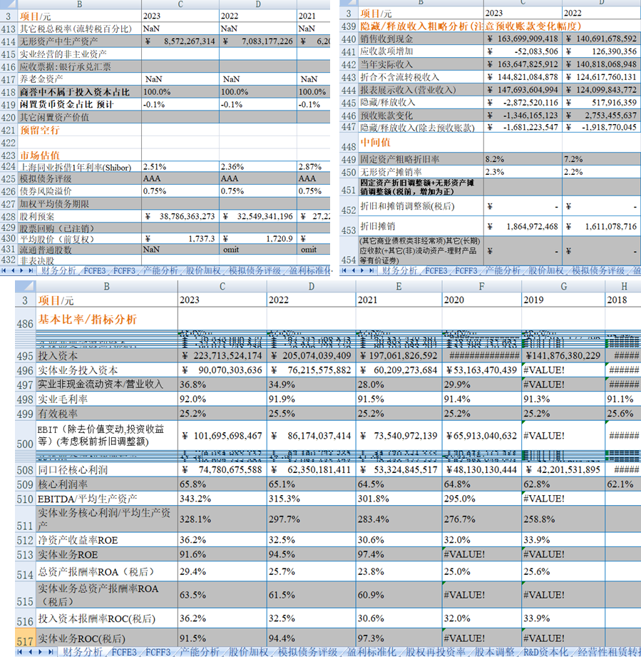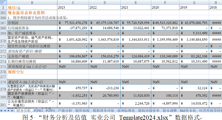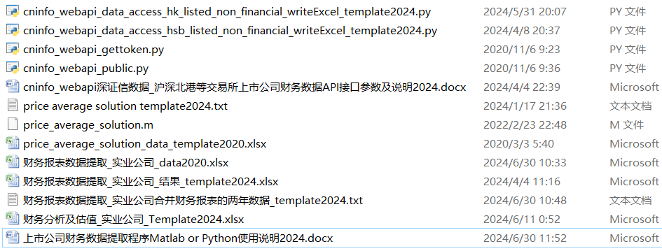 上海交易所、深圳交易所和北京交易所上市公司的财务数据提取运行“cninfo_webapi_data_access_hsb_listed_non_financial_writeExcel_template2024.py”,需深证信API接口的客户ID和秘钥,运行结果保存在“data_accessed1.xlsx”,防止失误损坏模板文件“财务分析及估值_实业公司_Template2024.xlsx”的数据或字体格式。数据提取结果包括所有财务报表和现金流量表补充数据,与使用Matlab读写Excel数据的各项一致。最后将“data_accessed1.xlsx”数据复制到“财务分析及估值_实业公司_Template2024.xlsx”进行基本的财务数据分析。