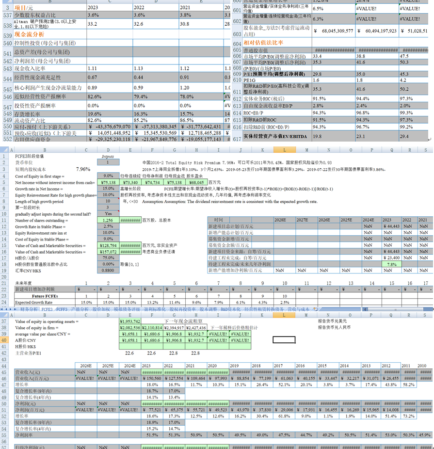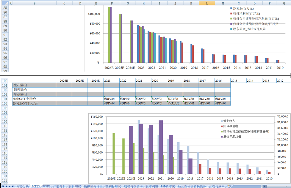 将写入“财务报表数据提取_实业公司_结果_template2024.xlsx”的数据复制到“财务分析及估值_实业公司_Template2024.xlsx”(两个表已设置相同文字格式),可以进行基本的财务数据分析,财务分析的计算公式来源信息隐藏在A列,左侧是合并财务数据,右侧是母公司财务数据。股价年均值可以运行Matlab代码“priceaverage solution template2024.txt”得到,运行时调用函数文件“price_average_solution.m”;股价每天收盘数据格式如文件“price_average_solution_data_template2020.xlsx”所示,可以从券商客户端下载。一般企业使用FCFE法估值,数据表“FCFE3”中营业收入和净利润数据模板考虑2010~2023年年度数据,主要估值指标有曲线图显示,不同企业的详细指标如产品产能、销量、单价等可以利用模板改写。