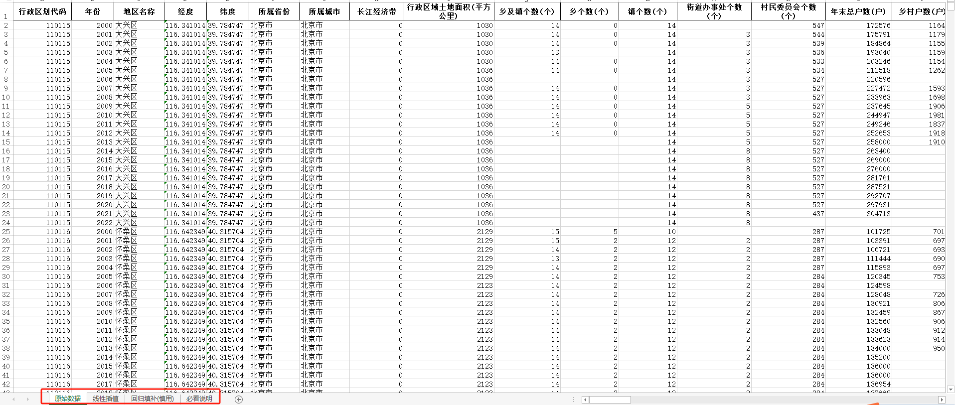 2001-2023年北京大兴怀柔平谷密云延庆中国县域统计年鉴(ARIMA填补无缺失版)面板数据经济农业工业教育卫生社会保障等