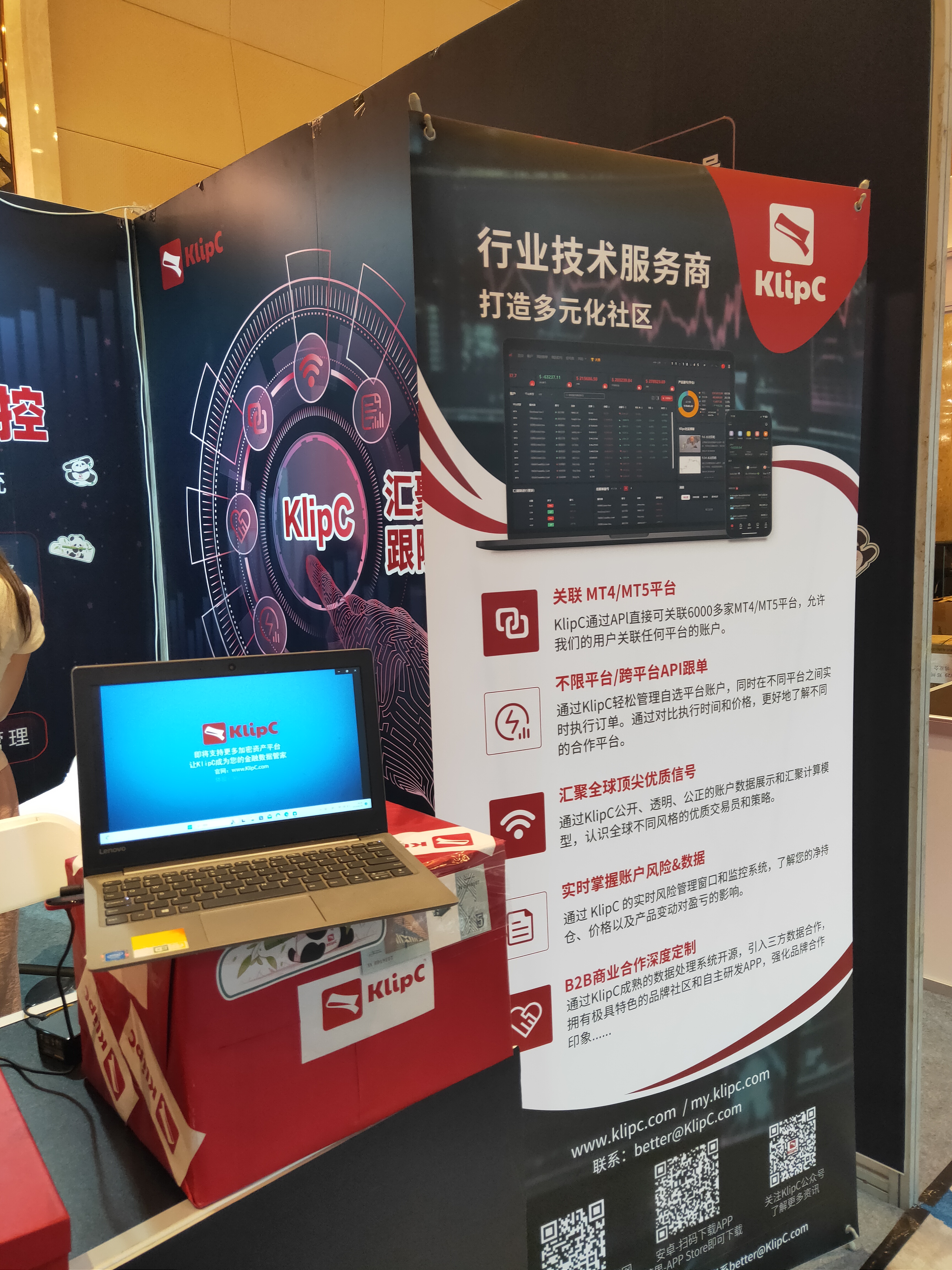 在展会期间,KlipC团队为大家详细介绍了KlipC应用平台以及平台目前所获得的成绩,其跨平台无限制、海量真实信号发布api跟单、封闭式多账户管理系统核心特点让展会现场来宾产生了很大的兴趣,并希望可以更进一步了解KlipC平台。