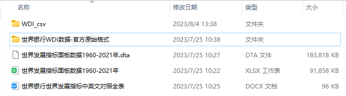 世界发展指标面板数据1400+指标世界银行WDI数据1960-2021年根据世界银行的WDI数据库,整理形成各国发展指标,涵盖1960-2021版本。WDI数据库是世界银行推出,最为权威的全球宏观经济数据库,包含全球200多个国家的经济、社会、环境等各方面的宏观指标。
