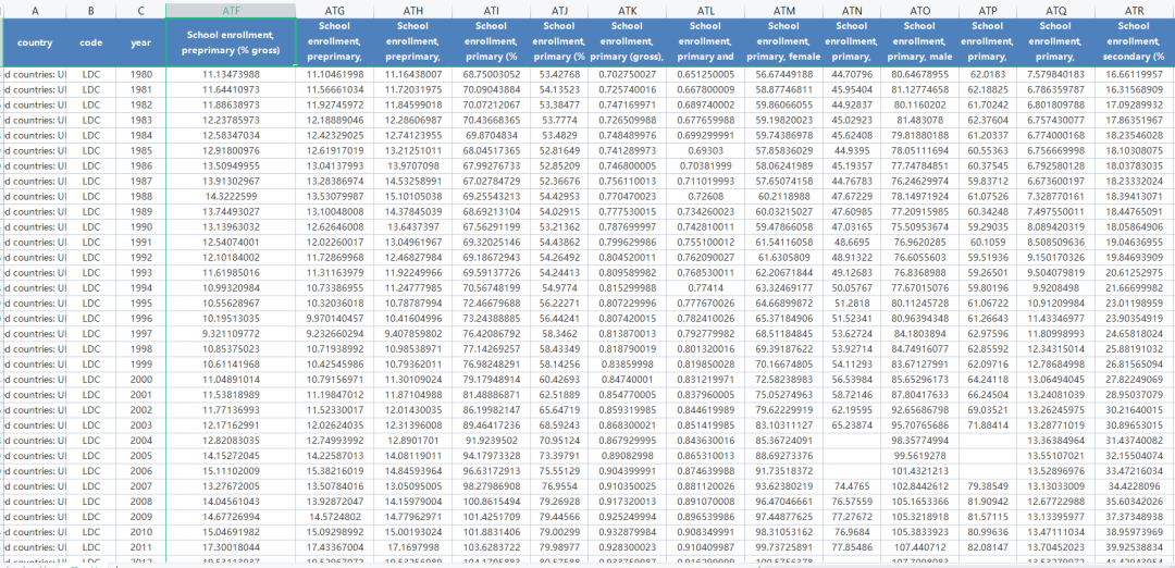 3、区域范围:世界,删除了部分如欧盟、北美、非洲、东盟等区域层级的数据,保留了国家层级的数据