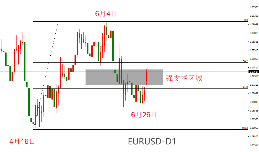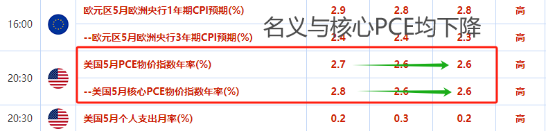 上周五公布的美国5月PCE数据显示,名义值低于前值0.1个百分点,核心值也低于前值0.2个百分点。通胀率持续下降,意味着美国的通胀数据已经摆脱平台期。按照当前的平均下降速度看,今年下半年至明年上半年,美国通胀率下降至2%目标区间的可能性较高。美联储货币政策对PCE数据表现异常敏感。5月PCE数据下降,美联储官员大概率会发飙偏鸽派言论,美元指数将在7月份持续受到利空冲击。EURUSD周一跳涨,就是基于美联储降息预期增强美联储官员态度由鹰转鸽的判断。