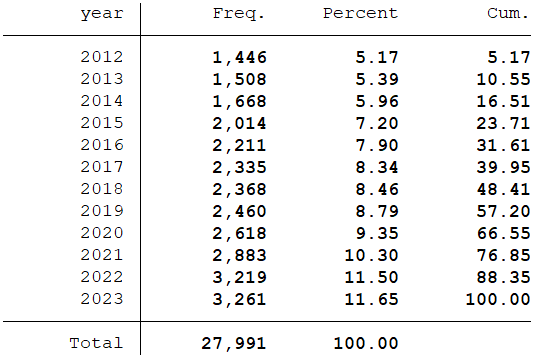 样本选择:全部A股2012-2023年数据(“研发支出”数据是从2012年开始,经过处理之后的数据起点为2012年)