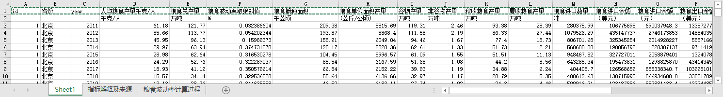 " 粮食波动率取绝对值 粮食播种面积 粮食单位面积产量 谷物产量 非谷物产量 秋收粮食产量 夏收粮食产量 粮食进口数量 粮食进口金额 粮食进口金额 "粮食出口金额