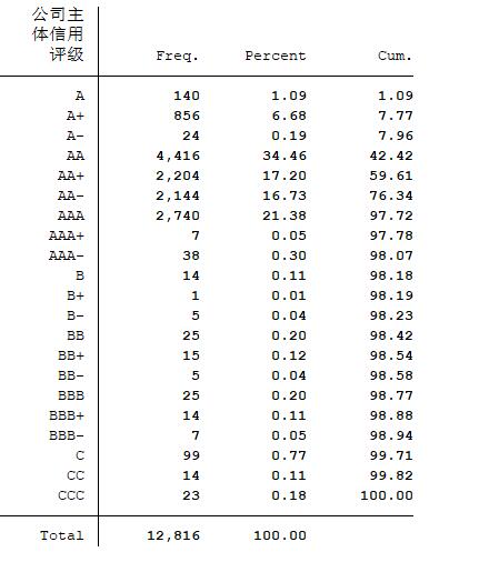 CC、C。除AAA和CCC级以下(包含CCC级)等级外,每个信用等级用“+”“-”进行微调,借鉴Afonso等[33]