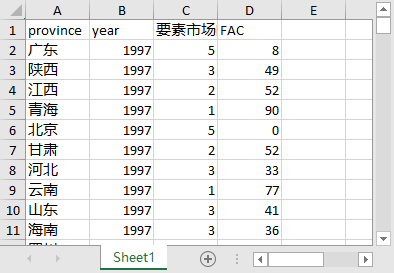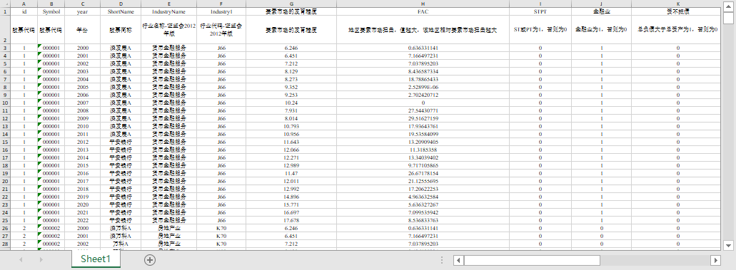 股票代码 股票代码 年份 股票简称 行业名称-证监会2012年版 行业代码-证监会2012年版 要素市场的发育程度 地区要素市场扭曲,值越大,该地区相对要素市场扭曲越大 ST或PT为1,否则为0 金融业为1,否则为0 总负债大于总资产为1,否则为0 沪深A股为1,否则为0 北京A股为1,否则为0 制造业取两位代码,其他行业用大类 所属省份代码 所属省份 所属城市代码 所属城市