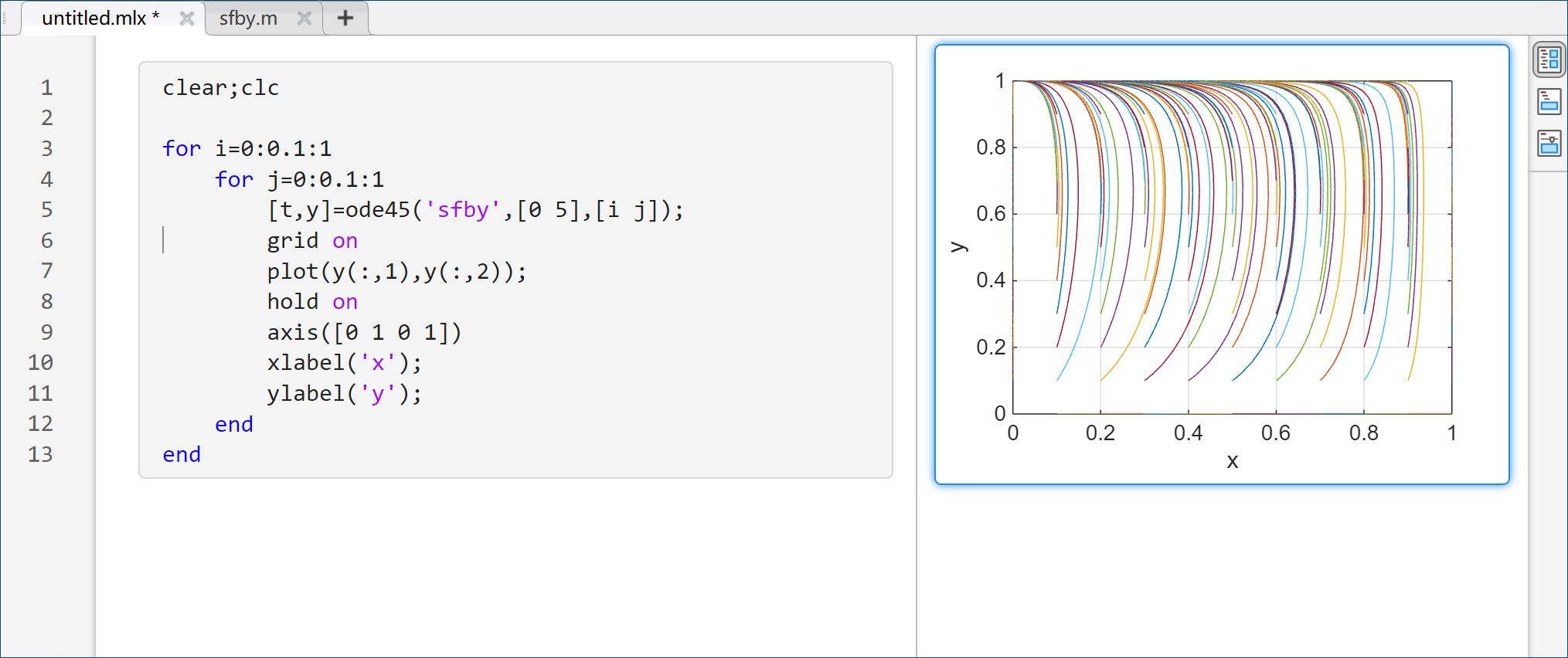 [t,y]=ode45('sfby',[0 5],[i j]);
