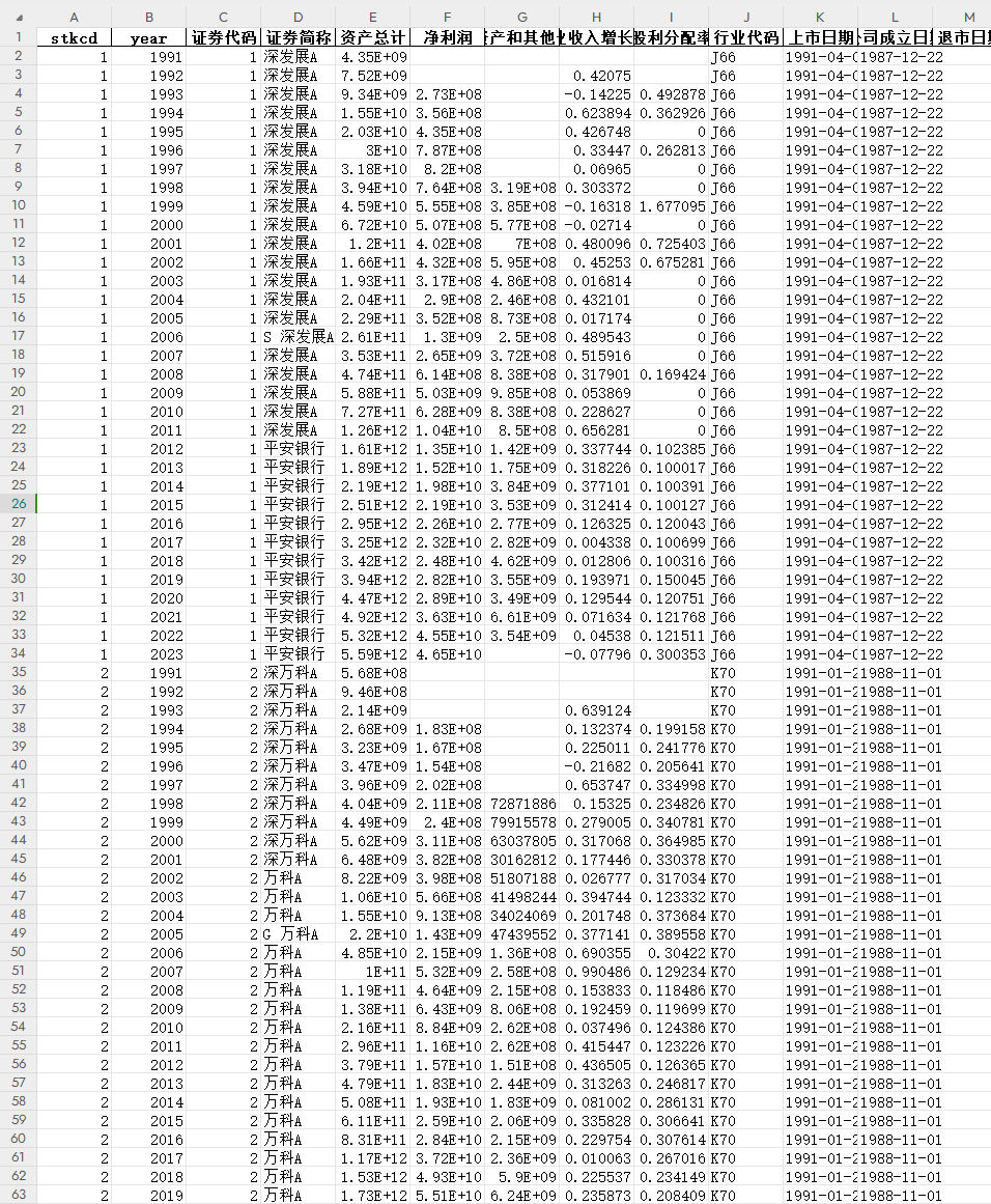 二、指标说明共计15个指标:stkcd、year、证券代码、证券简称、资产总计、净利润、购建固定资产无形资产和其他长期资产支付的现金、营业收入增长率B、股利分配率、行业代码、上市日期、公司成立日期、退市日期、总得分、企业生命周期