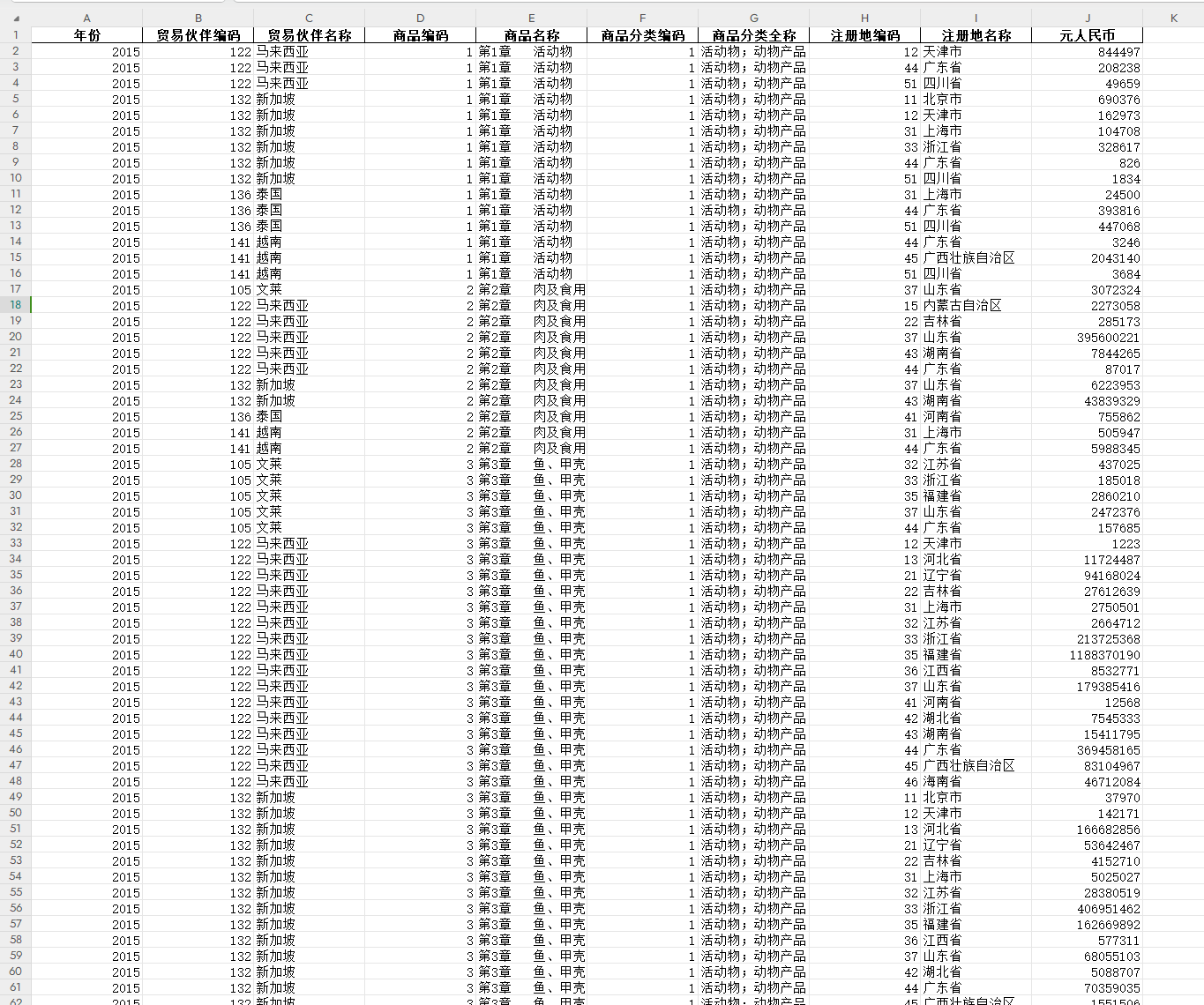 二、指标说明共计10个指标:年份、贸易伙伴编码、贸易伙伴名称、商品编码、商品名称、商品分类编码、商品分类全称、注册地编码、注册地名称、元人民币