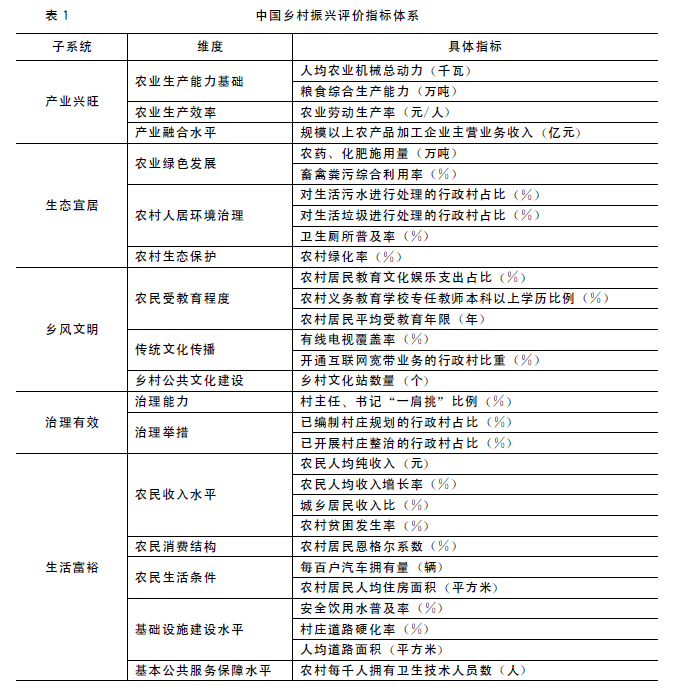 基于以上对乡村振兴内涵的阐述,在遵循科学性、可行性、可测性和数据可获取性等原则的基础上,构建了包含产业兴旺、生态宜居、乡风文明、治理有效和生活富裕五个子系统,共包含30个具体指标的中国乡村振兴评价指标体系。