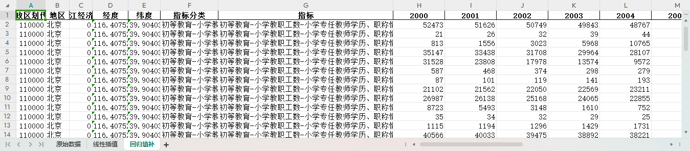 excel数据文件包原始数据(由于多年度指标不同存在缺失值)、线性插值、回归填补三个版本,提供您参考使用。