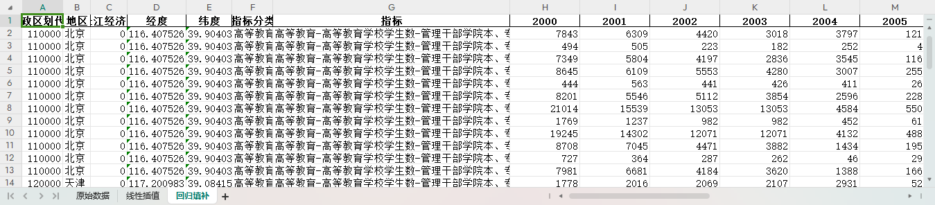 excel数据文件包原始数据(由于多年度指标不同存在缺失值)、线性插值、回归填补三个版本,提供您参考使用。