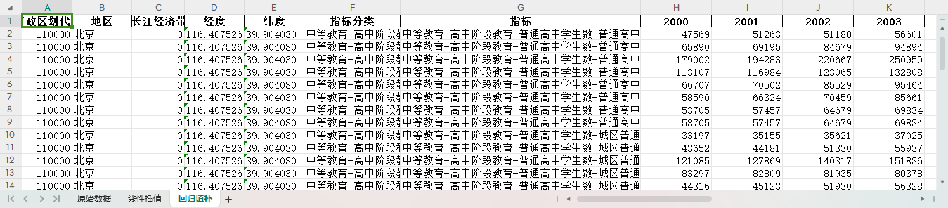 excel数据文件包原始数据(由于多年度指标不同存在缺失值)、线性插值、回归填补三个版本,提供您参考使用。