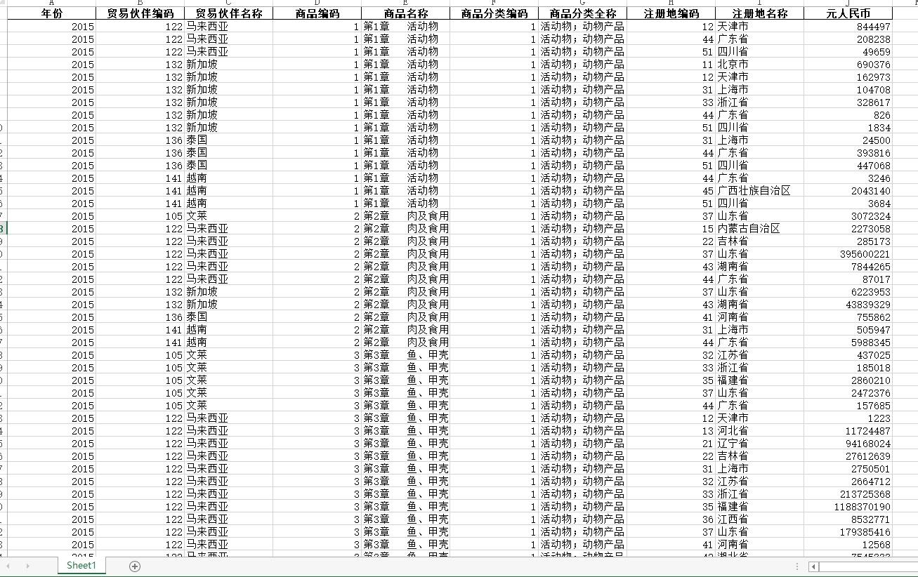 | 年份 | 贸易伙伴编码 | 贸易伙伴名称 | 商品编码 | 商品名称 | 商品分类编码 | 商品分类全称 | 注册地编码 | 注册地名称 | 元人民币 |