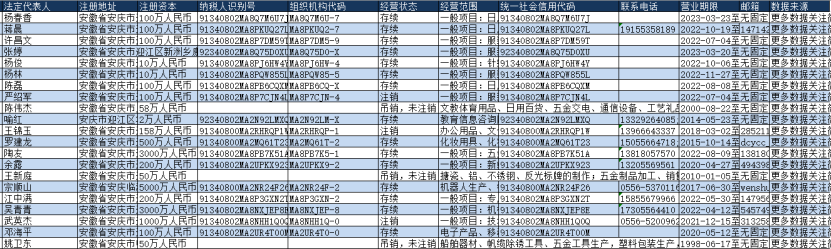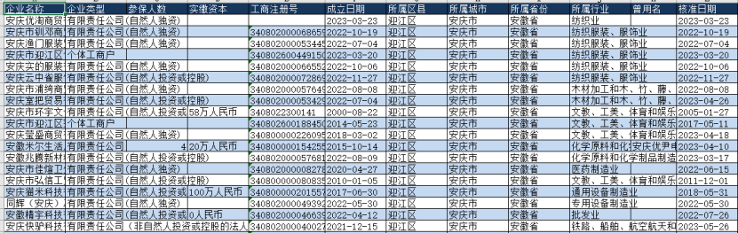 数据指标下图为部分数据展示,此处仅展示了安徽省安庆市的5G行业工商注册企业的部分数据。本数据集包含亦其他地级市的5G行业工商注册企业数据。