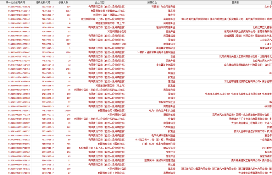 全国各地市州区县63w+有小程序注册的企业汇总数据2024年02月参保人数所属行业
