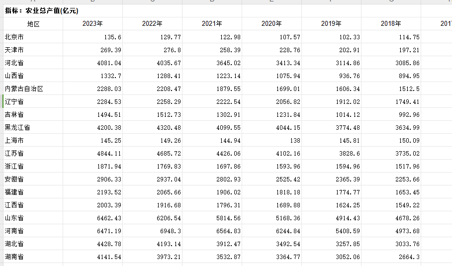 2、指标:农林牧渔总产值、农业总产值、林业总产值、牧业总产值、渔业总产值