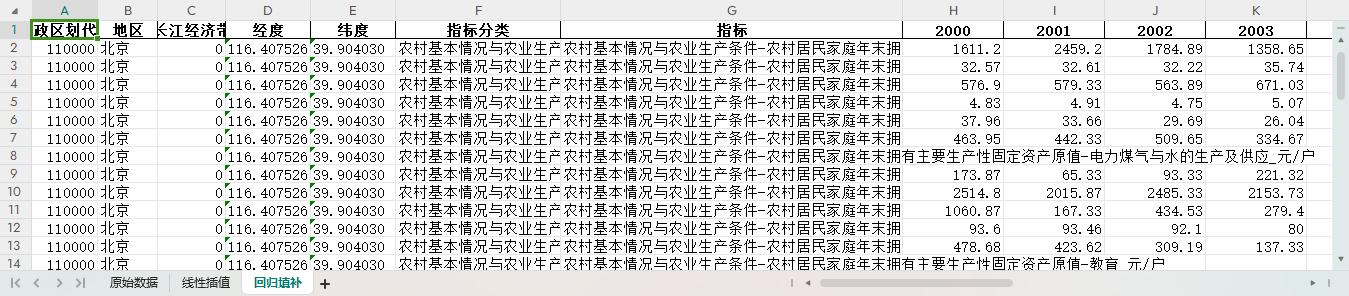 excel数据文件包原始数据(由于多年度指标不同存在缺失值)、线性插值、回归填补三个版本,提供您参考使用。