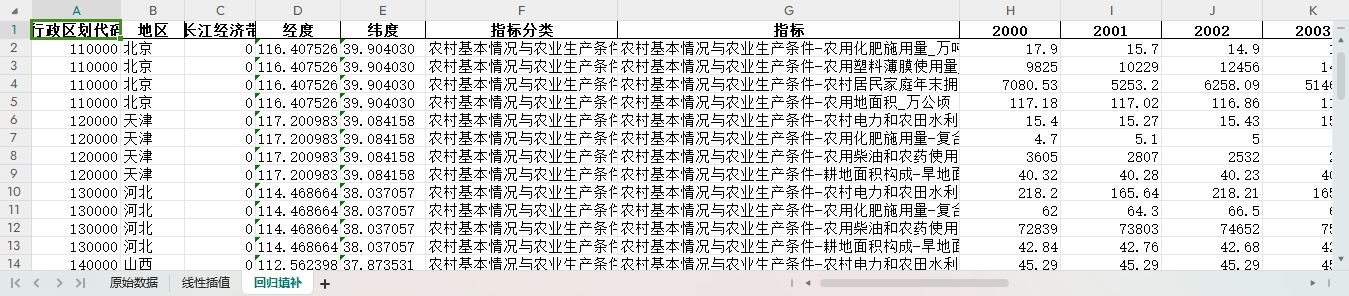 excel数据文件包原始数据(由于多年度指标不同存在缺失值)、线性插值、回归填补三个版本,提供您参考使用。