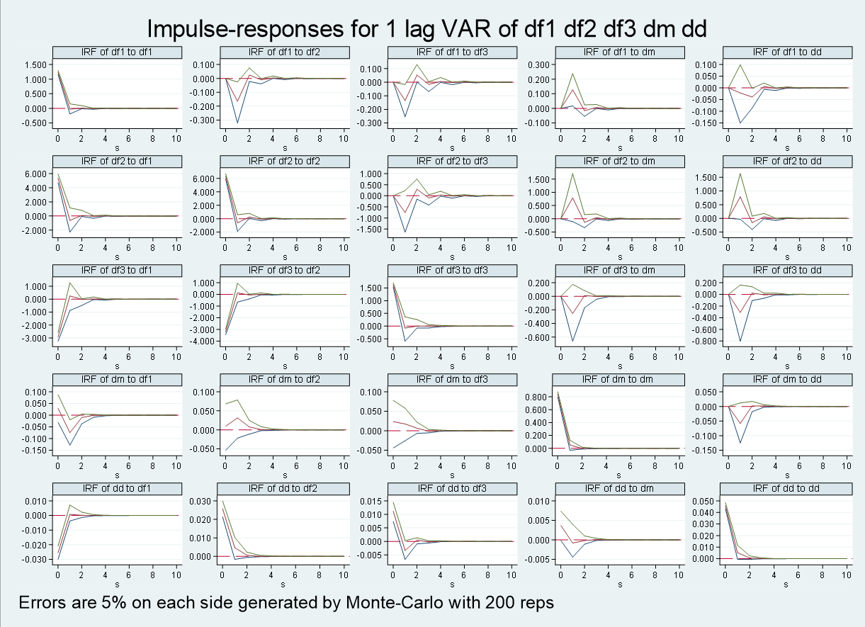 我看论文上的许多脉冲响应图都有比较长的冲击影响,但是我的图基本上都是到一两期以后就全部归零了。求求大佬们来看看是怎么回事,以及我的模型是不是存在问题。用的是PVAR模型。