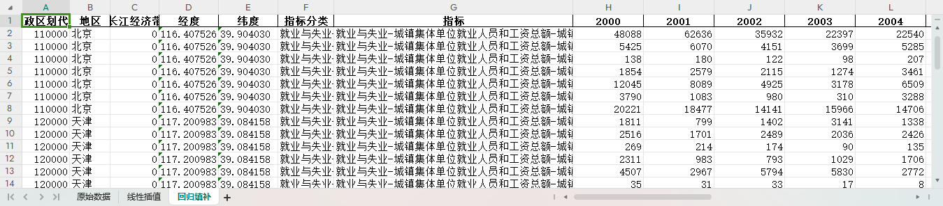 excel数据文件包原始数据(由于多年度指标不同存在缺失值)、线性插值、回归填补三个版本,提供您参考使用。