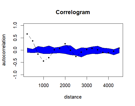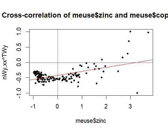 注意:查了下原文的图片,回归线都是过原点的,意味着变量和空间权重矩阵都是标准化的。R包给的案例都是用坐标系生成空间权重矩阵,导致空间权重矩阵是非标准化的。那么问题来了,如何使用自己设置的矩阵做双变量交叉散点图呢?期待大佬们自己深入研究吧。