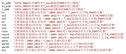 计算方法(以极端高温为例):首先将各地级市1974-2003年共30年的气象数据作为参考基础数据,根据各城市逐日最高温度的升序序列,将第90百分位的值作为极端高温的阈值。接着计算各地级市每年最高温度超过90百分位极端高温阈值的天数得到极端高温数据。另外,在极端高温的逐日数据基础上计算连续极端高温的次数来反映热浪:包括连续3天以上的极端高温和连续5天以上的极端高温的来反映热浪次数。