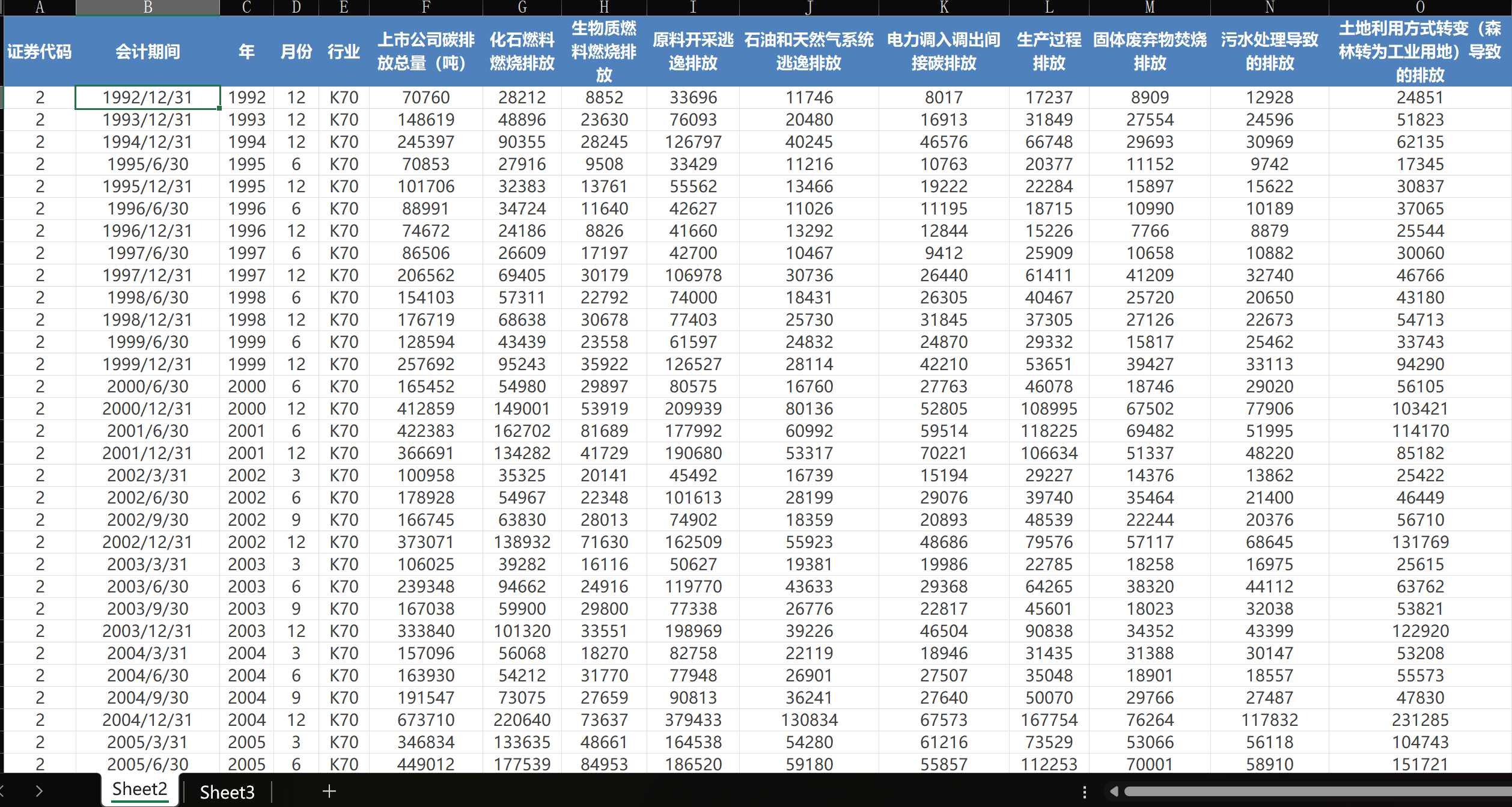 数据说明:具体包括证券代码、会计期间、年、月、行业、上市公司碳排放总量、化石燃料燃烧排放、生物质燃料燃烧排放、原料开采逃逸燃烧排放、石油和天然气系统逃逸排放、电力调入调出间接碳排放、生产过程排放、固体废弃物焚烧排放、污水处理导致的排放、土地利用方式转变导致的排放