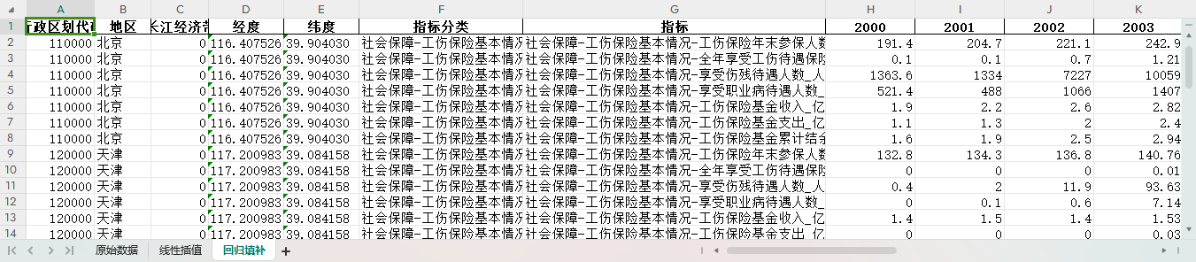 excel数据文件包原始数据(由于多年度指标不同存在缺失值)、线性插值、回归填补三个版本,提供您参考使用。