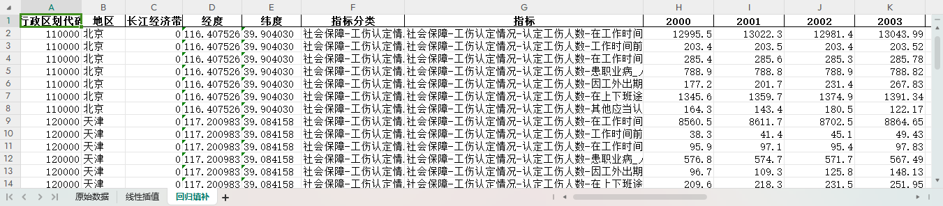 excel数据文件包原始数据(由于多年度指标不同存在缺失值)、线性插值、回归填补三个版本,提供您参考使用。