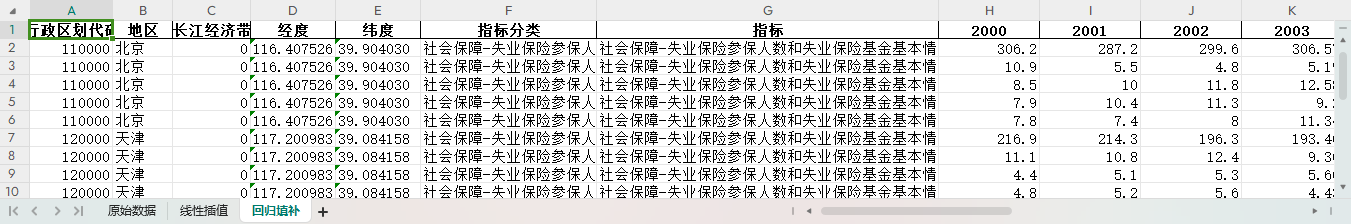 excel数据文件包原始数据(由于多年度指标不同存在缺失值)、线性插值、回归填补三个版本,提供您参考使用。