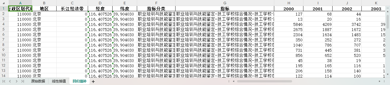excel数据文件包原始数据(由于多年度指标不同存在缺失值)、线性插值、回归填补三个版本,提供您参考使用。