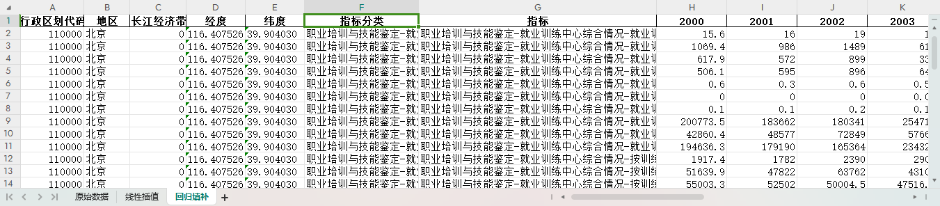 excel数据文件包原始数据(由于多年度指标不同存在缺失值)、线性插值、回归填补三个版本,提供您参考使用。