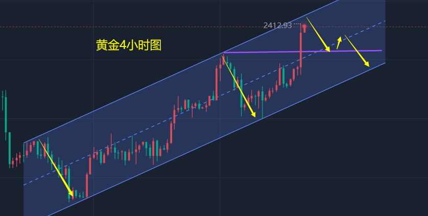 我的分析基于技术面和CPI数据,坚定认为黄金有望涨至2400美元关口。但接下来,若黄金在2410美元上方,我将不再看涨,并可能选择看跌,因技术面分析显示有回撤调整的可能。