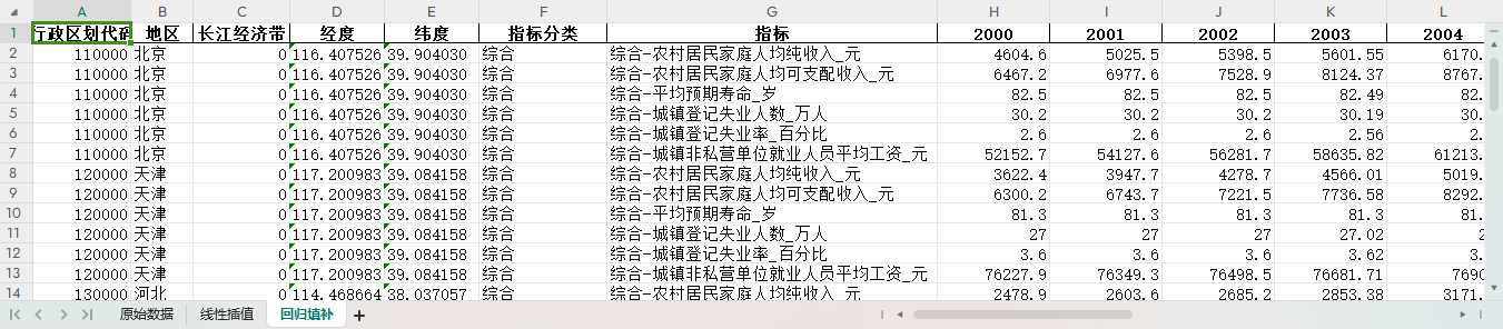excel数据文件包原始数据(由于多年度指标不同存在缺失值)、线性插值、回归填补三个版本,提供您参考使用。