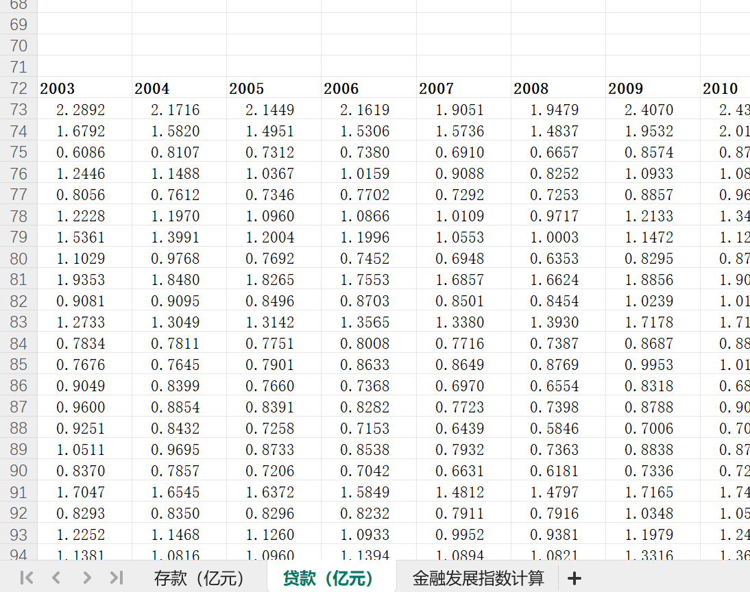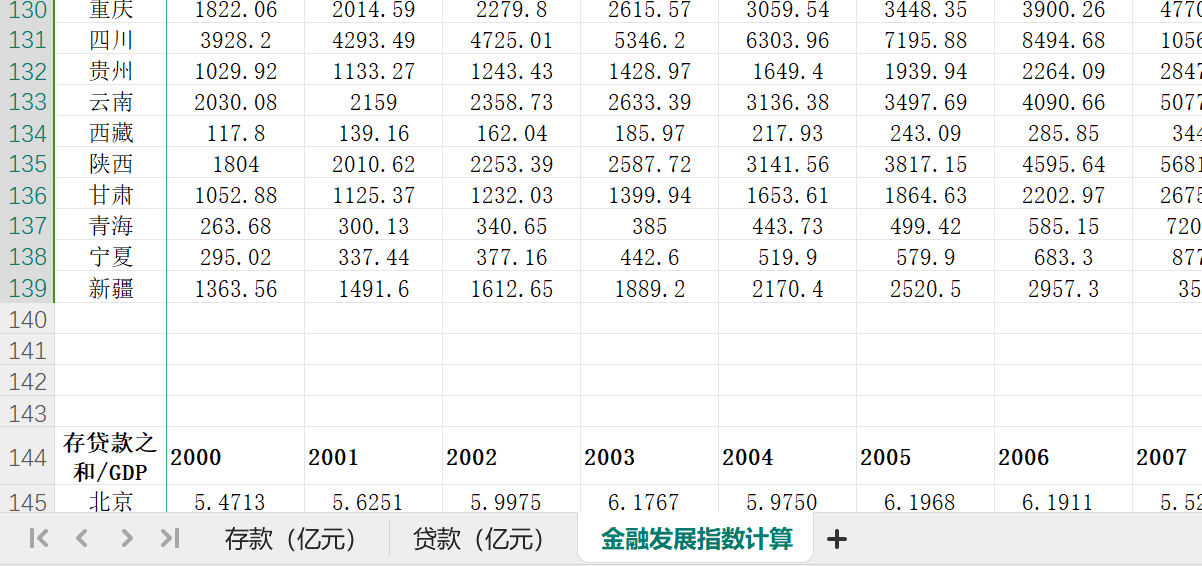 数据说明:包括各省金融机构存款余额、贷款余额和GDP三个原始指标,使用存贷款余额总额比地区GDP得到金融发展水平指数