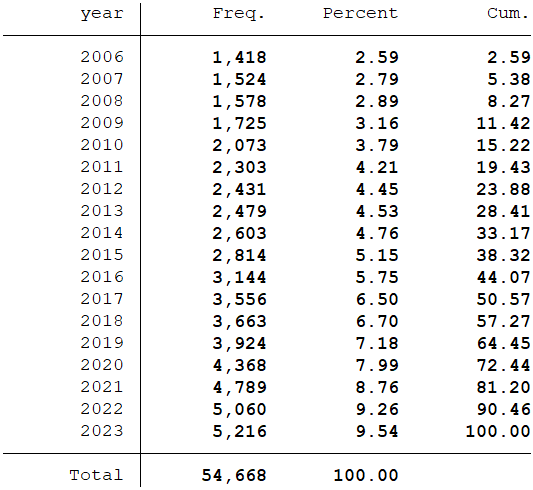 gen zombie = (total_adjusted_profit < 0) if year > 2006 & year <= 2023