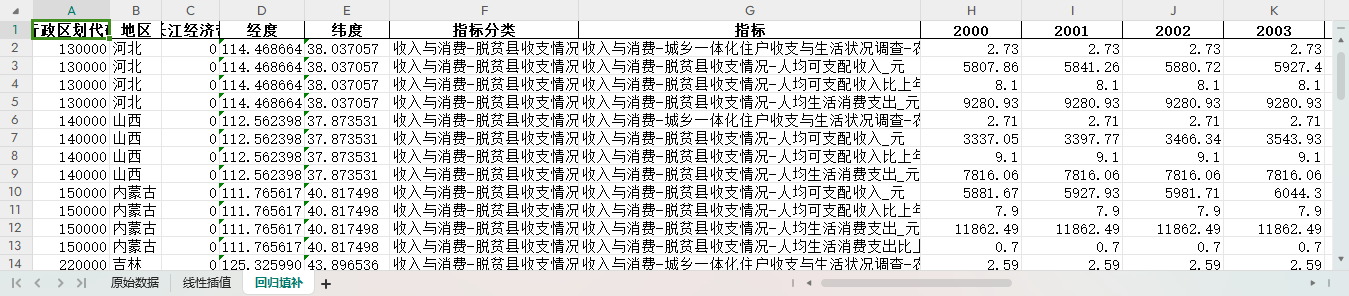 excel数据文件包原始数据(由于多年度指标不同存在缺失值)、线性插值、回归填补三个版本,提供您参考使用。