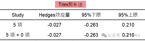 Trim剪补法时剪去漏斗图中不对称项,并且沿漏斗图中心两侧填补上被剪切部分,并且基于剪补后数据重新进行效应量计算,以校正异质性问题带来的效应量偏差。表格中列出的第1行为真实数据结果,第2行为填补后的校正数据结果;如果两行结果完全一致,则意味着并没有进行填补处理。