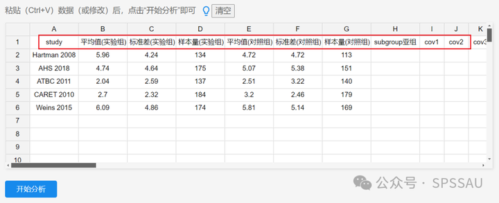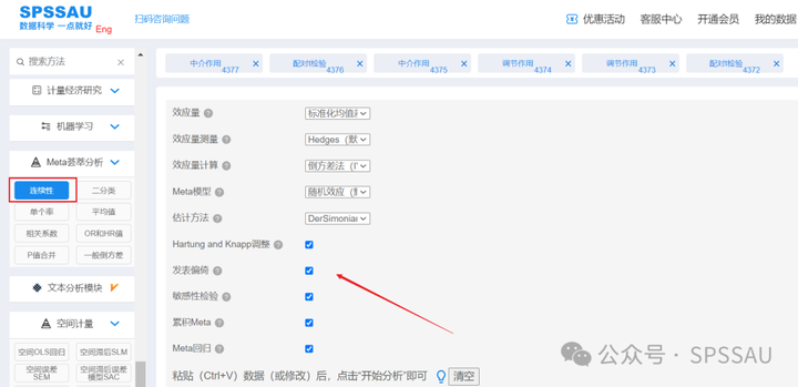 以连续性数据Meta分析为例,SPSSAU操作截图如下: