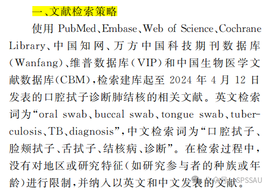 - 文献检索策略:可通过手工或计算机进行,涵盖国内外常用数据库如知网、万方、维普、中国生物医学文献数据库、Pubmed、Cochrane Library、Embase、Web of Science等。检索时需使用中英文关键词,通常结合主题词和自由词进行数据库搜索。此外,还需设定检索时间和其他条件限制,如检索语言等。