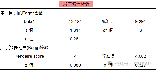 如果两类检验对应的p值大于0.05,则认为不存在发表偏倚,反之说明可能存在发表偏倚。