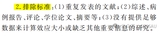 (2)文献排除标准重点排除两方面的文献——不符合分析要求的研究(类型、对象或指标不匹配),以及文献质量欠佳的研究(如全文不可得、样本量过小、数据无法获取或专业性不足)。举个例子,以下呈现的文献排除标准可供参考,其体现了前述原则的具体应用。