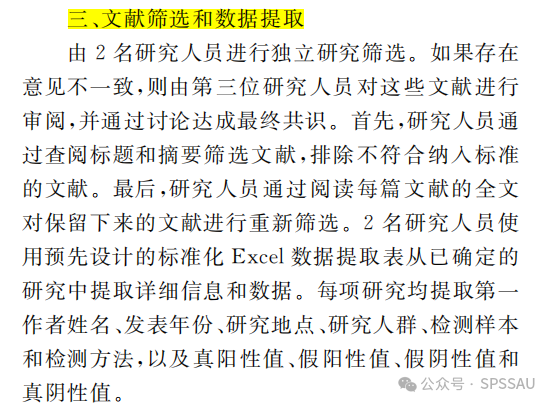 (2)数据提取将筛好的文献中的数据仔细提取到excel表里,注意格式要统一,方便后面导入软件里计算。文献筛选和数据提取的撰写可参考以下文献:
