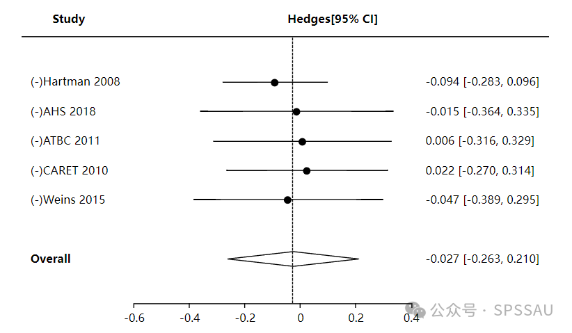 上表格展示效应量结果,包括各研究文献的效应量及其95%置信区间,并且展示各文献对于‘合并效应’的贡献情况即权重值,权重越大意味着该文献对于Meta合并效应的影响力度越大。本案例共5篇文献,各篇文献的权重值基本均在在20%左右。