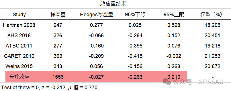 Meta分析的核心之一是对各个研究的效应值进行合并计算。合并效应值可以反映干预措施的整体效果,并对研究结果的可靠性和准确性进行评估。以连续性数据Meta分析为例,SPSSAU输出效应量结果如下图: